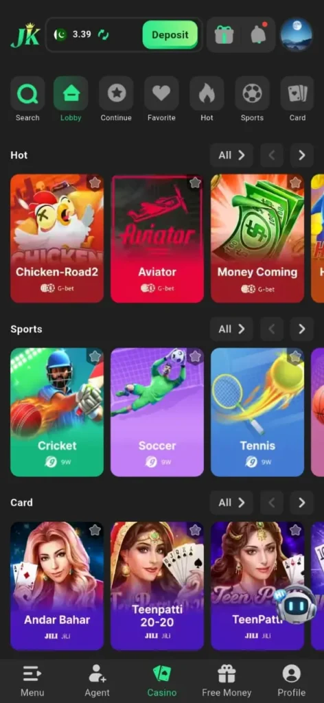 One of the strongest aspects of JeetKing App is its clean and easy-to-navigate interface. All tabs are arranged systematically, so users never struggle to find games or account options.